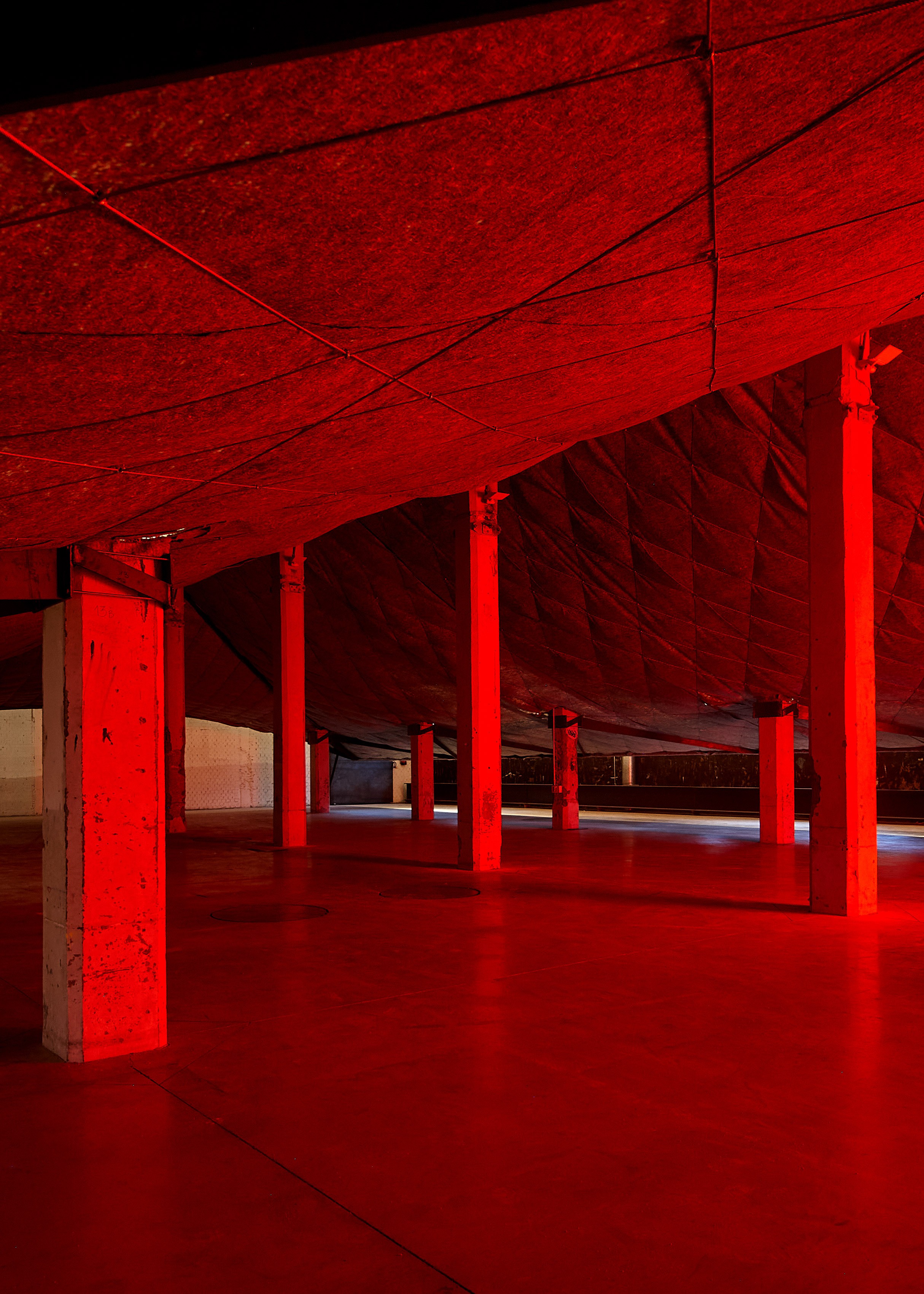 Guillermo Santomà ha transformado el espacio de Intermediae parasitándolo con una intervención que utiliza los mismos materiales industriales de la nave, cemento y hierro, para hacerla desaparecer. En consecuencia, propone un espacio con un aura radicalmente diferente a la de la nave original. La propuesta se materializa en una gran cubierta autoportante rematada en cemento. Las acciones se condensan bajo esta gran cubierta, mientras que todo lo que ocurre entre la cubierta y la nave no es más que un diálogo de coexistencia forzado, que hace que se pongan en valor mutuamente con su contraposición.Caparazón o cobijo, este objeto-lugar adquirirá movimiento, vida o, incluso, consciencia propia al ser habitado. Tal y como señala Chus Martínez en su texto ‘Sí a todo’ (julio 2020) sobre ‘Pista de baile’, ‘la cueva industrial abstracta […] está orientada a originar nuevos procesos rituales entre los individuos que se den cita en ella’. En su interior, ‘una bola de luz grande y poderosa nos proporciona un poco de calor, como un nuevo sol’. El espacio necesario y único en el que puede desarrollarse todo este universo.